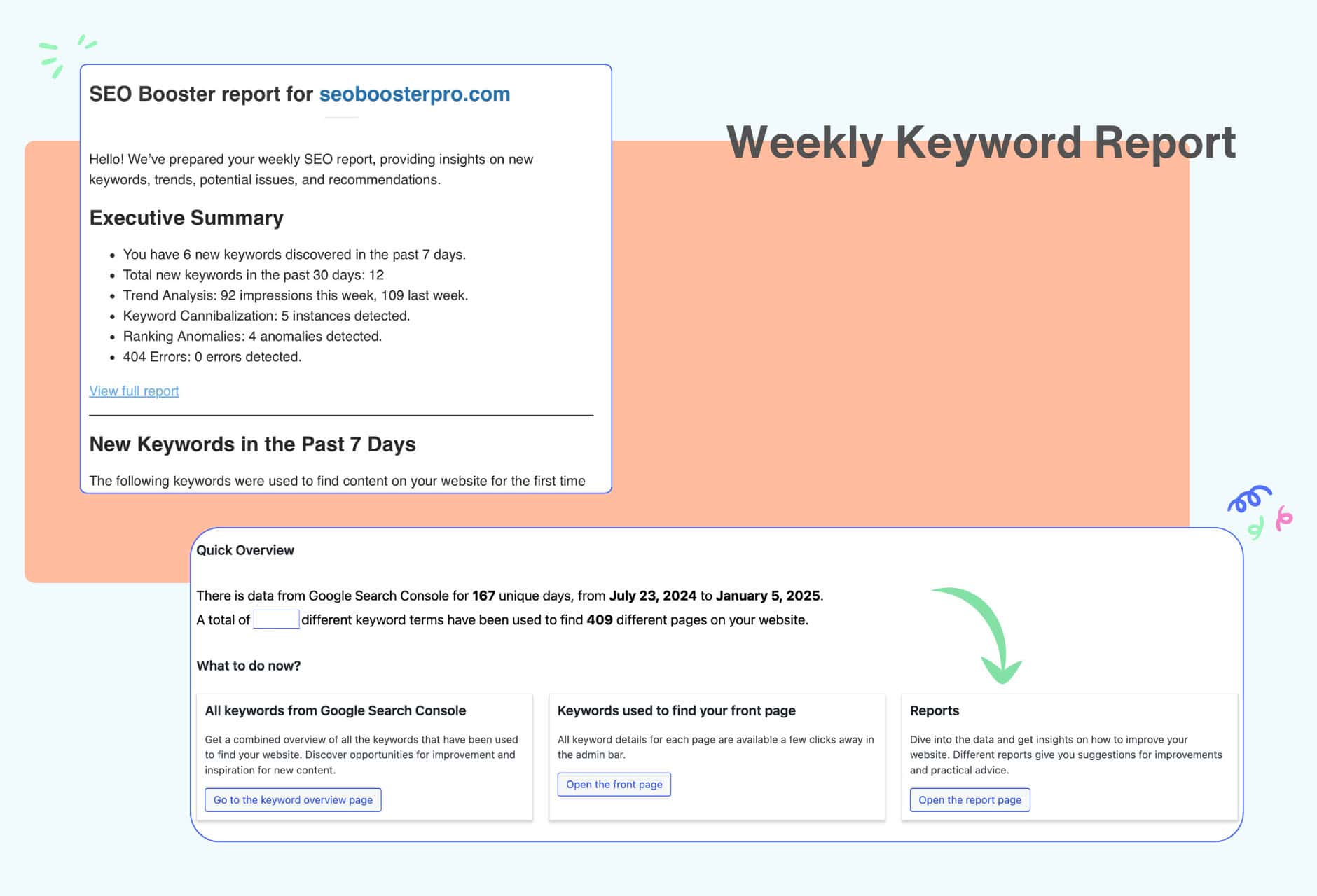 Never miss a beat with detailed, easy-to-read reports delivered to your inbox every week. Track your top-performing pages, keyword cannibalization issues, and SEO progress without logging in.